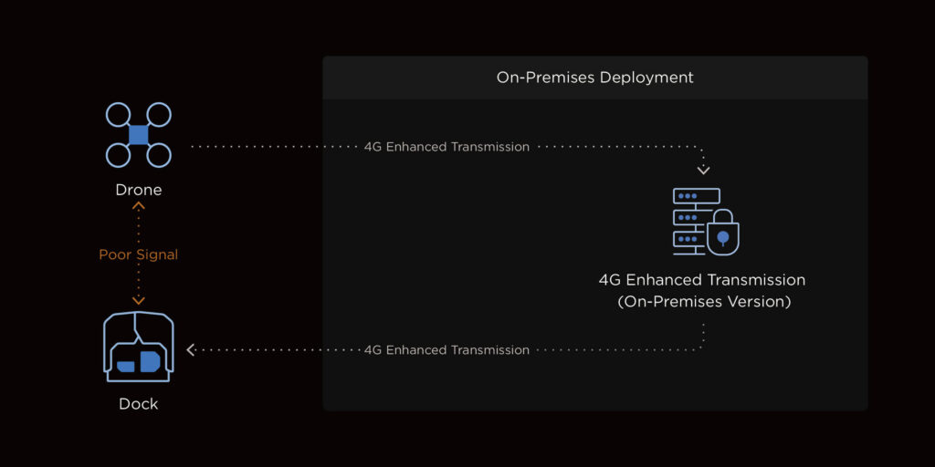 Matrice 4D Series can operate with the DJI RC Plus 2 Enterprise remote controller for standalone use while featuring an innovative onboard relay function. With this setup, one drone can fly high as a relay, allowing another drone to operate at a greater distance. The relay drone automatically faces the operating drone, [5] ensuring smooth video transmission without a 4G signal or in obstructed conditions. [19] This capability significantly extends the transmission range, making it ideal for SAR tasks and inspections in mountainous areas